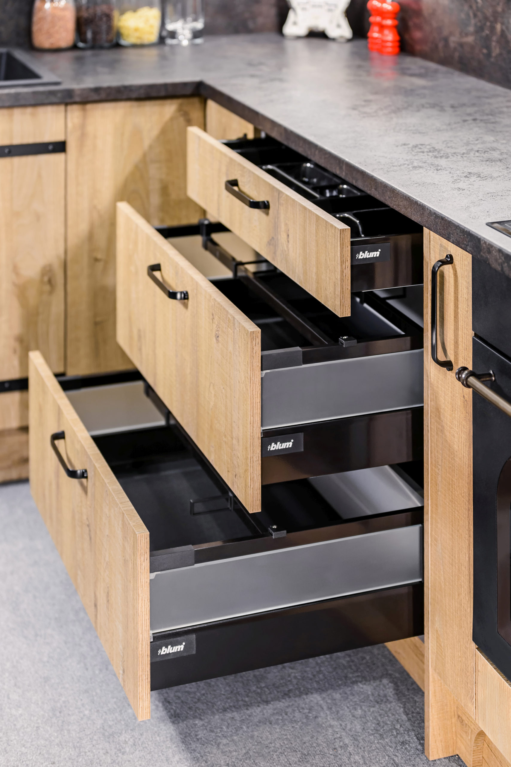 Wygoda i względy praktyczne zawsze są na pierwszym miejscu, jednak w przypadku nowoczesnych systemów szuflad nie musimy rezygnować z aspektów wizualnych. Chociaż wnętrze szuflady pozostaje ukryte za frontem, kiedy ją otworzymy, może cieszyć oko wysoką jakością i nienagannym dopasowaniem kolorystycznym do całej zabudowy. Wnętrze szuflad można idealnie dopasować do frontów mebli, tworząc atrakcyjną i spójną wizualnie aranżację. Jeżeli zdecydowaliśmy się na modne czarne fronty, w takim samym kolorze możemy wybrać kolor wnętrza szuflad. Podobnie w przypadku jasnych dekorów, nie będziemy mieli trudności z wybraniem koloru, który będzie harmonijnie komponował się z całością.