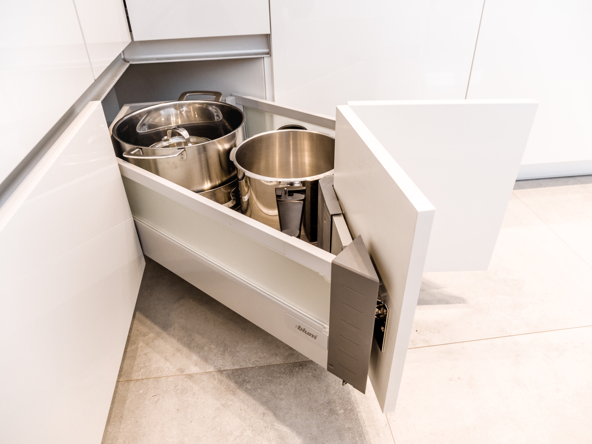 Szuflady są niezastąpione również do zagospodarowania miejsc z utrudnionym dostępem, jak narożniki w zabudowie meblowej. Szafki z tradycyjnymi półkami nie będą tutaj zbyt wygodne, ani nie ułatwią nam szukania i wyjmowania głęboko schowanych naczyń. Chcąc oszczędzić sobie pracy i niepotrzebnych frustracji, zastąpmy je szufladami, które można wysunąć przed korpus szafki, zapewniając sobie dostęp od razu do całej zwartości.